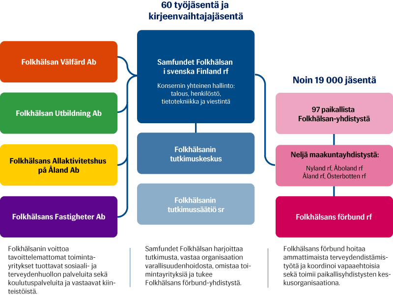 Folkhälsan on monipuolinen organisaatio, joka koostuu useista eri osista, joilla on erilaiset roolit, mutta yhteinen tavoite – luoda turvallisempaa, aktiivisempaa ja terveellisempää elämää.