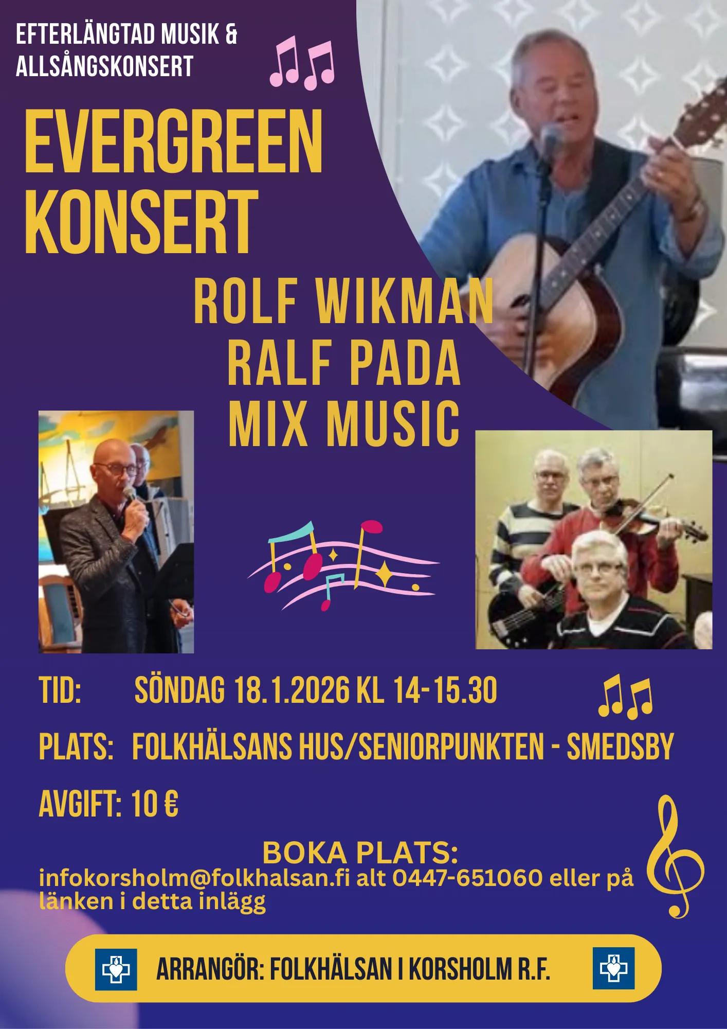 Evergreen-konsert - en stund av musik & minnen med Rolf Wikman, Ralf Pada och Mix Music. Låt dig svepas med av tidlösa evergreens – sång och musik som berör.