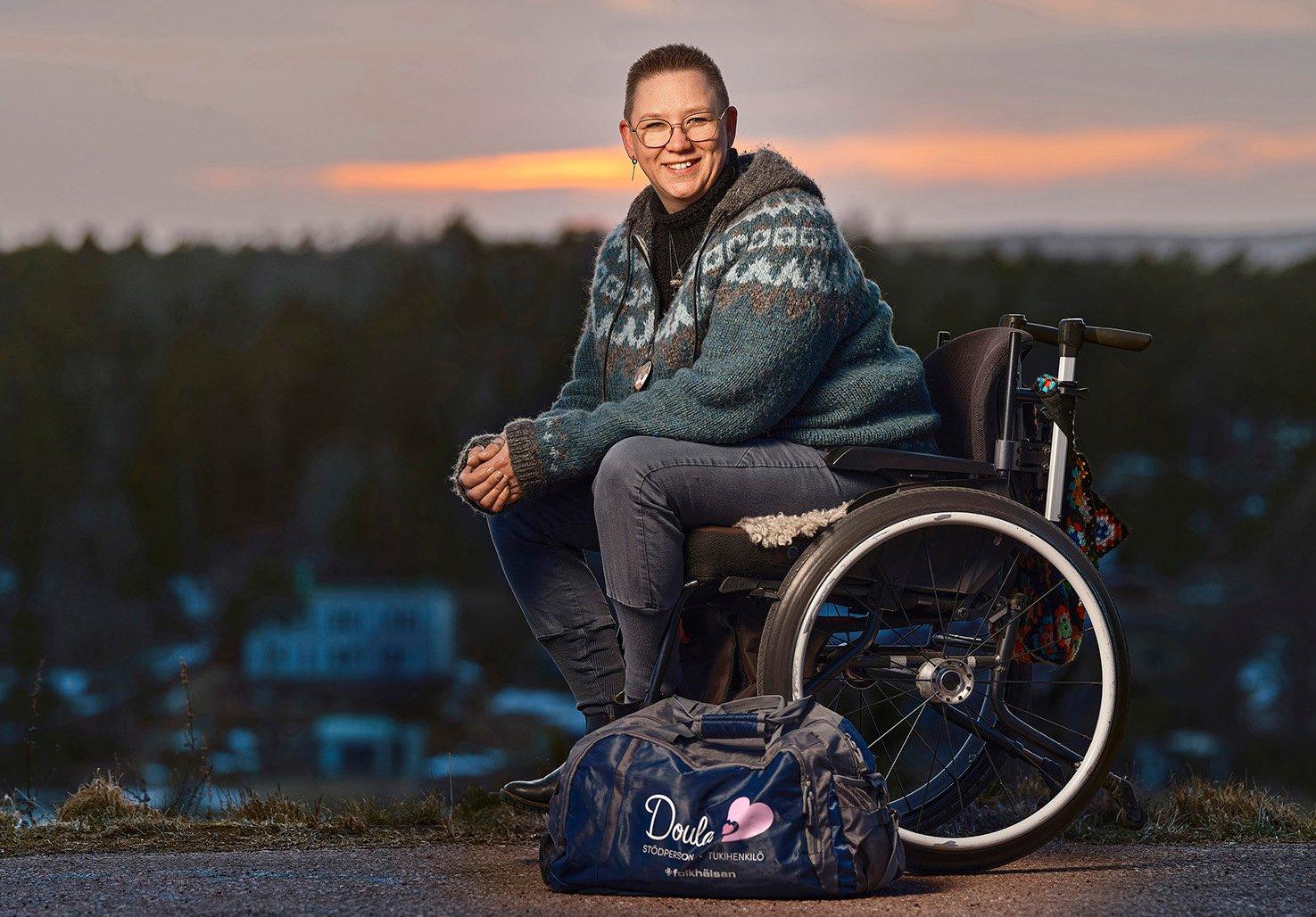 Miina Fagerlund lever med en genetisk bindvävssjukdom och använder rullstol. Hon har assistenter och behöver stöd i vardagen – men i doulauppdraget arbetar hon utifrån sina egna förutsättningar.