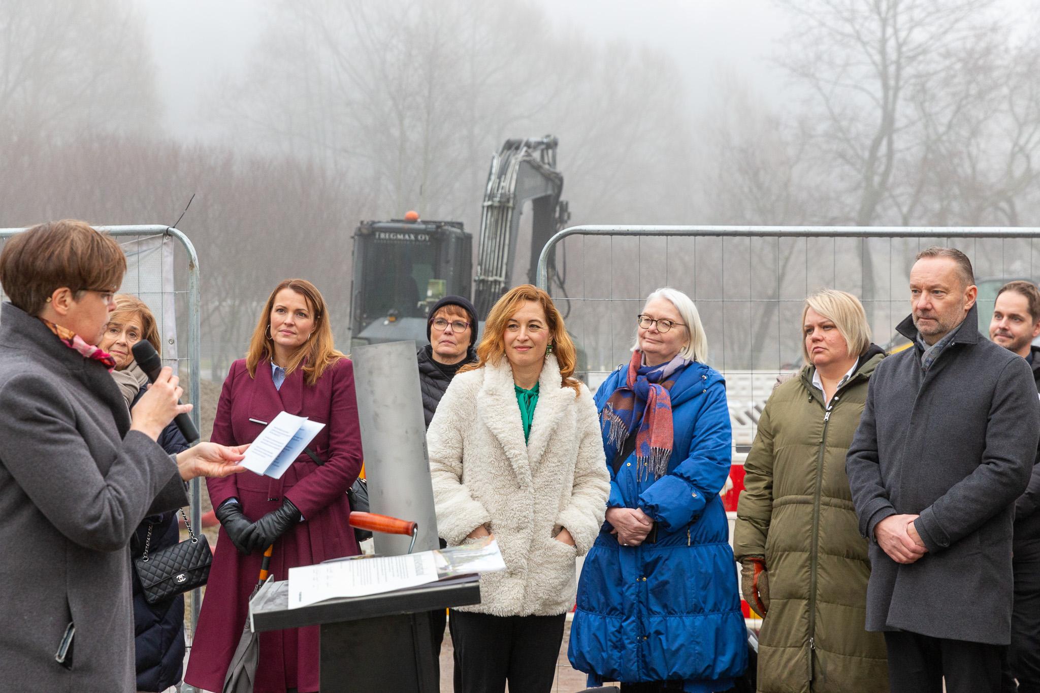 Himlen var lika grå som murbruket i betongkvarnen när ett trettiotal personer samlades vid Köpingsvägen 9—11 i Helsingfors för att mura grundstenen. Folkhälsans tf kommunikationsdirektör Johanna Savander hälsade alla välkomna och överlämnade sedan ordet till Samfundet Folkhälsans styrelseordförande Siv Sandberg. Hon talade om hur Folkhälsan alltid har blickat framåt och varit en föregångare när det gäller boende för äldre.