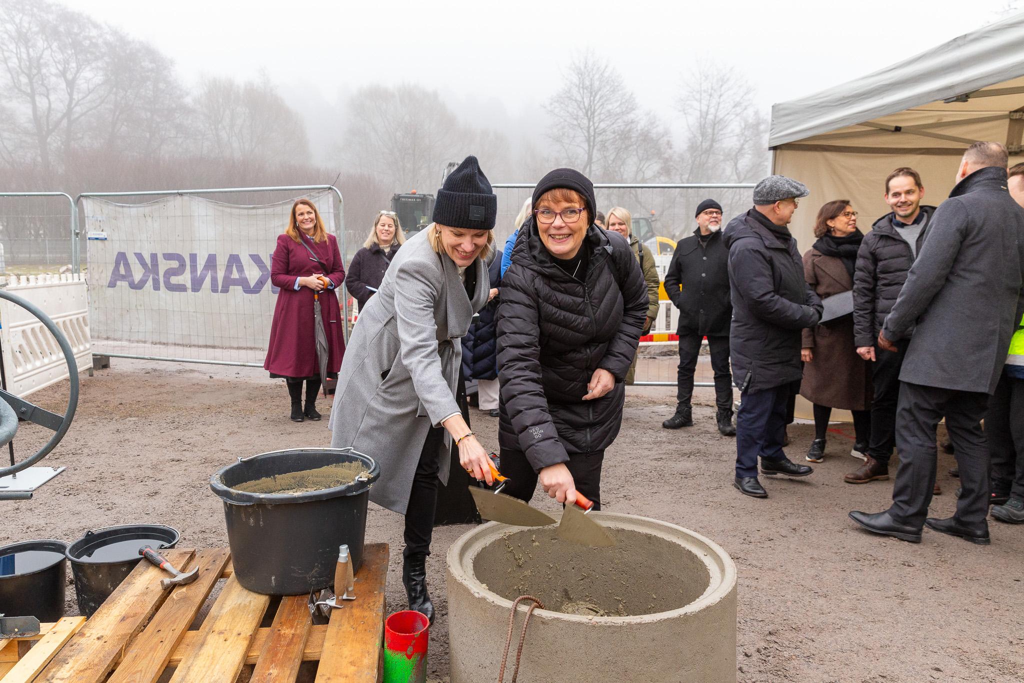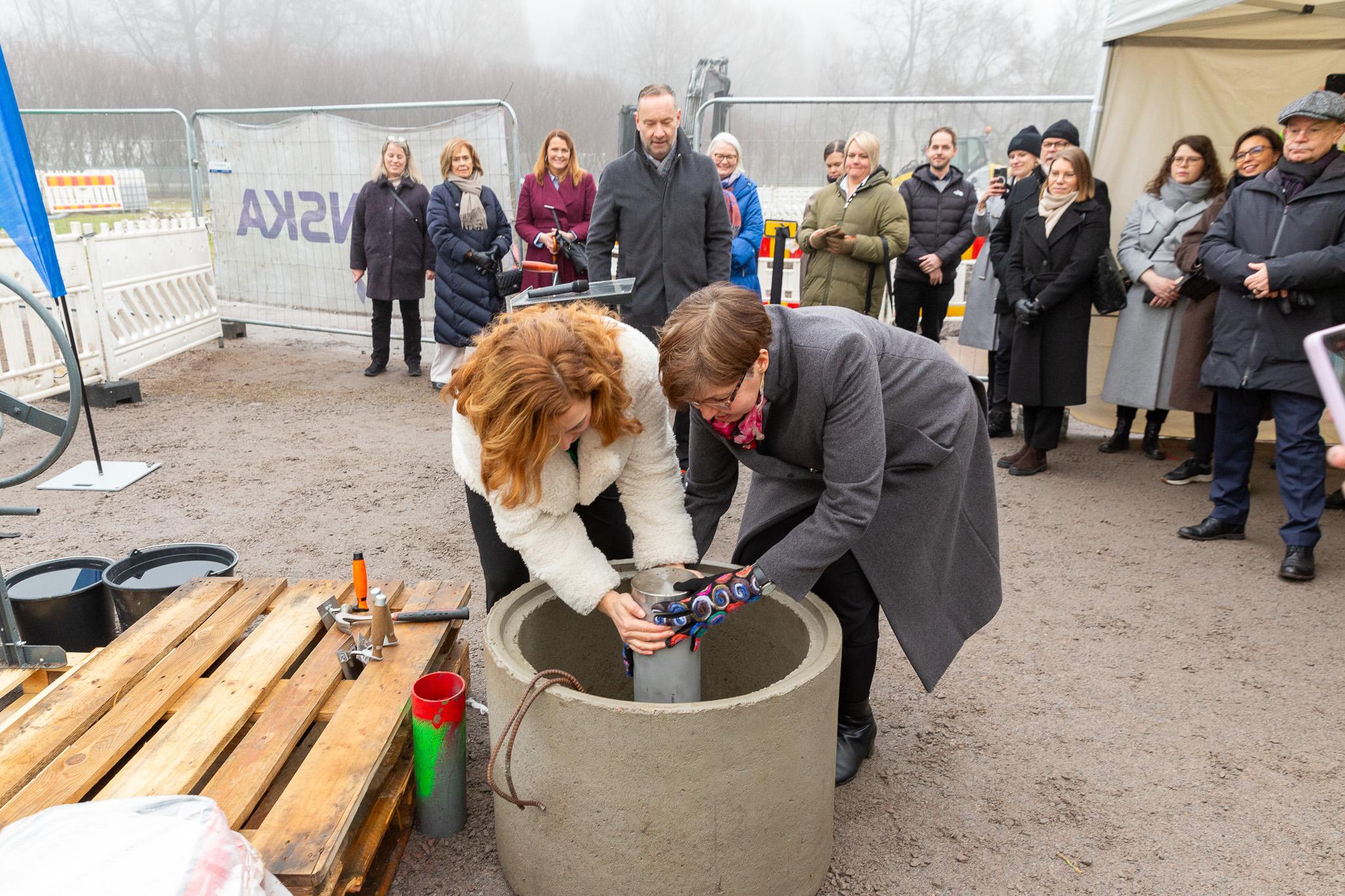 Verkställande direktör Anna Hellerstedt och ordförande Siv Sandberg lägger ner tidskapseln som sedan täcks med murbruk.