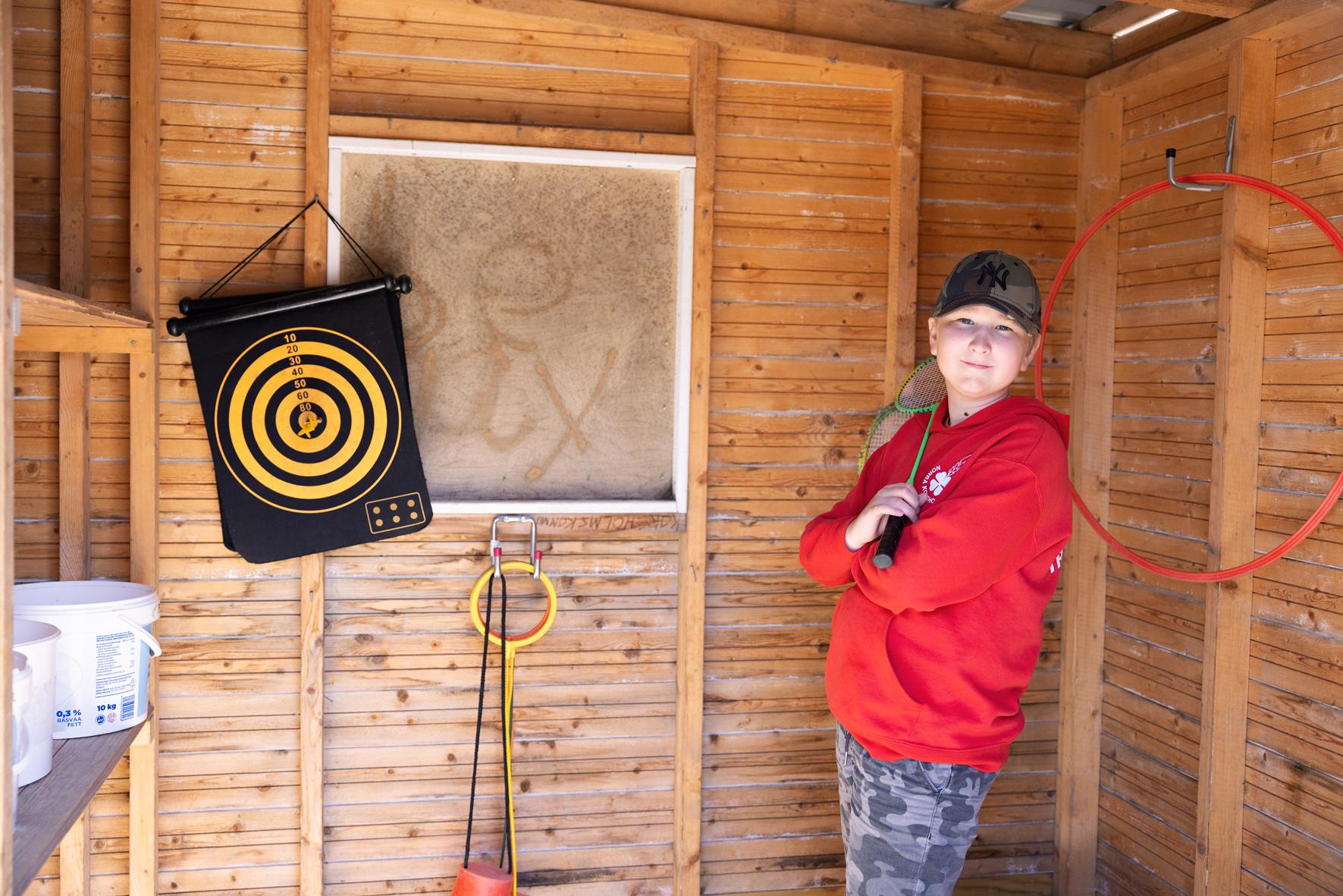 På skolgården finns en raststuga där man förvarar bollar, spel och andra uteleksaker, och det är Wilmer som har stenkoll på utlåningen. Inför vårt besök har han städat och ordnat upp i stugan. Hopprepen hänger i fina rader och alla bollar finns i stora korgar på golvet.