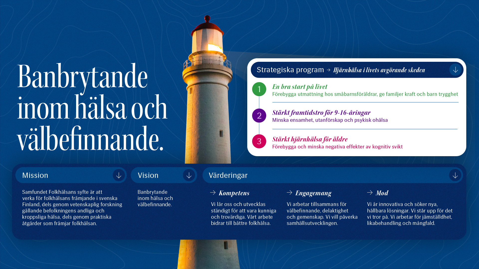 Visionen ger riktningen framåt och visar att Folkhälsan är en föregångare. Visionen kan ses som stjärnan som leder organisationen på vägen, men också som ett mått på ambitionsnivån för Folkhälsans verksamhet.
